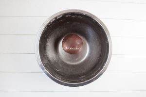 翻拌均匀,巧克力混合溶液会很快将粉末吸收,但是此时的面团拌起来已经很费力了