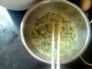 鸡蛋打散放入香椿碎,盐,胡椒粉,味精搅拌均匀