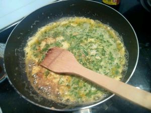 蛋液香椿凝固后铲成小块儿继续翻炒均匀,