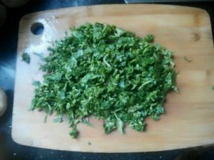 焯过水捞出过冷水,稍微挤干多余水分(或放一边沥干也可),然后切碎。