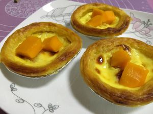 再将剩余的芒果粒摆放两颗在出炉的蛋挞上面~