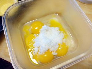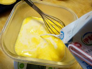 把分离好的蛋黄中加入白糖/炼乳/牛奶(牛奶在做之前,先放微波炉加热)搅拌均匀。
