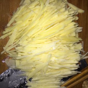 切好的土豆丝过水冲一下 油锅烧热放入干辣椒土豆丝翻炒 放入盐醋 鸡精