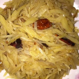 花椒粒捞出不要,放葱丝、青红椒、土豆丝,(土豆丝泡洗的越清爽,炒好了越清脆)翻炒,放醋,当然各种醋都可以,大家不用纠结,继续翻炒~