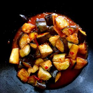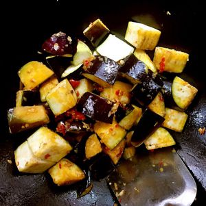 将之间搞好的茄子等倒入锅内