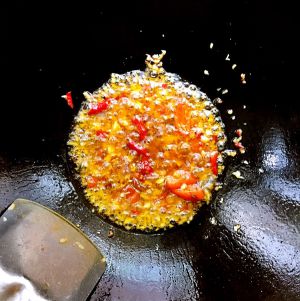 锅內放少油,放入蒜蓉姜粒煎出香味后,调小火放几滴鱼露,鱼香味扑鼻而来,放酱油加点水和糖,适量加点老干妈,煮开后,用生粉十水倒入煮成糊状,如图示