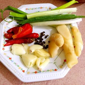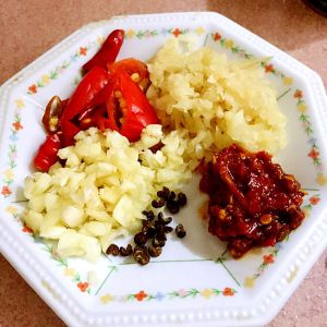 大蒜、泡姜切末 花椒拍碎 泡椒切成小段儿 葱段切成葱花