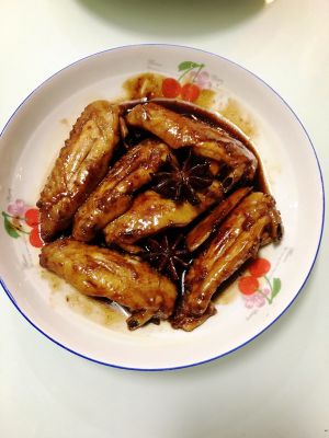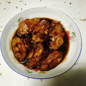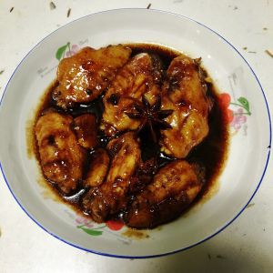 倒入可乐,直至淹没鸡翅,滴入少量酱油提色,小火煮直至可乐变成浓汁,装盘。