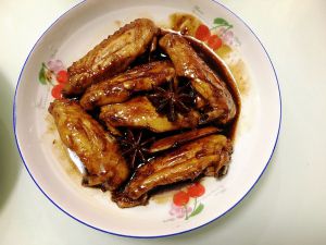 第三步:鸡翅下锅煎至双面泛黄,侧边也要一起煎一下,放入姜片两片,八角两个,一起炒出香味…