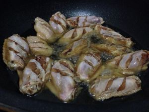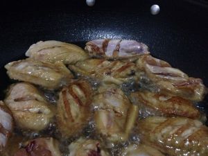 锅中倒入适量油,待油热以后用筷子夹起鸡翅放入锅中(不要整盘倒入锅中,腌制的汤汁留着备用)