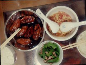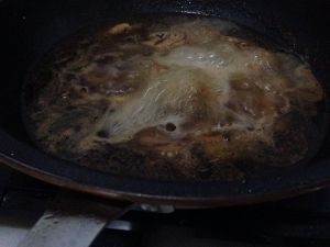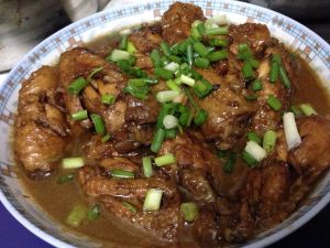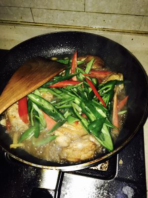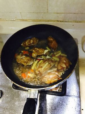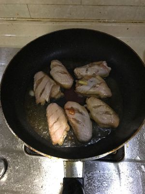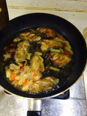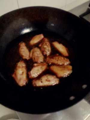 热锅冷油,放上去煎,煎到两面黄黄的就下可乐(下了空了多少的可乐)(老爸老妈煮的时候忘记去拍照了!没图),去焖,大概3-5分钟(要收汁就行了)