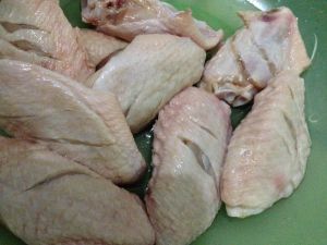 首先将鸡翅洗净割皮