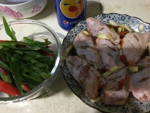 腌制时,将红椒,青椒切丝备用