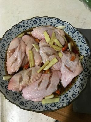 鸡翅表面划两个口子,用料酒和少许盐腌制