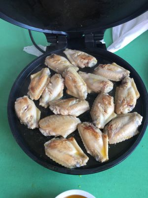 鸡翅煎好后、电饼档里滴油不要扔掉、另起一个锅把油倒里、放姜、八角炒香加鸡翅加一点东古一品鲜加点盐味精And可乐加可乐那么多水这个时候加入干辣椒(喜欢就加)然后等汁收干、装盘。Duang~
