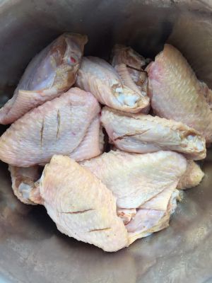 鸡翅洗净后用刀在鸡翅两面划上几刀、加点一品鲜、味精十三、料酒、精盐腌制一会儿、我是忘了水煮但是也不错。