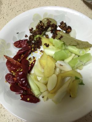 准备好材料,葱姜蒜,辣椒花椒,丁香八角香叶