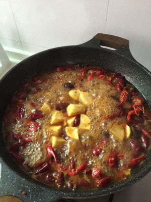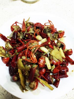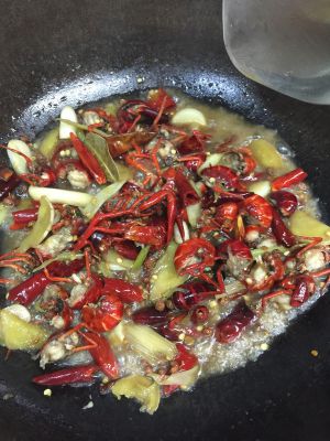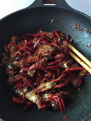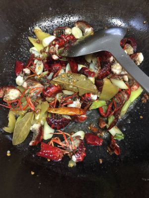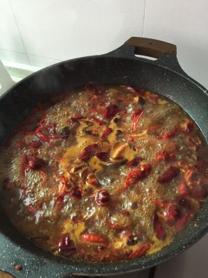 小龙虾下锅,待不动后,放干辣椒、花椒。