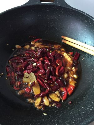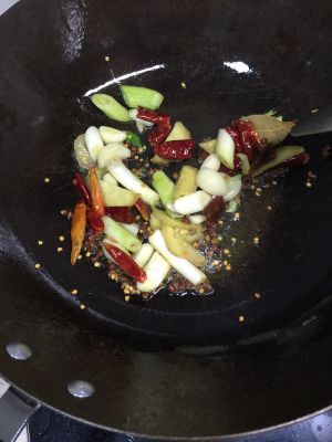 下辣椒,麻椒,香叶,此时中小火,不然容易糊。切记。辣椒变浅色,出了香味儿,开始下一步。