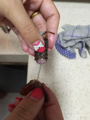 尾巴中间的那片,左拽右拽,使劲儿一拽,整条虾线就下来了。