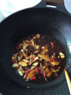 锅里放油姜片郫县豆瓣,小火翻炒香味出来为止