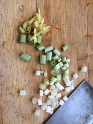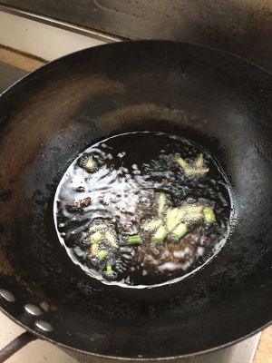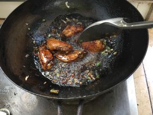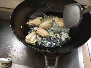锅里加少许油,爆香姜丝和葱白后滑至锅边缘。放入鸡翅,鸡皮疙瘩一面朝下,先煎出油来,待两面煎至金黄,加入适量生抽。