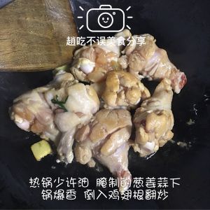 热锅入油 腌制的葱姜蒜爆香 倒入鸡翅根翻炒