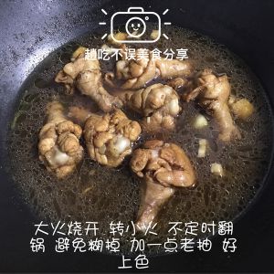 鸡翅放入锅里,小火慢煎,两边金黄色后,加入腌鸡翅的汤料。