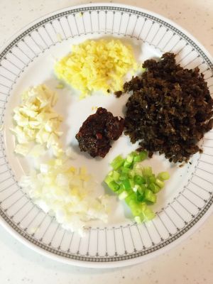 把葱、姜、蒜切成末,备用。碎米芽菜,备用,中间那一坨我用的是麻辣烫底料,只要一勺即可。
