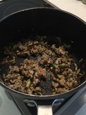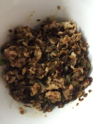 再放猪肉末,一半变色的时候放碎米芽菜,全变色之后,放入少量酱油、蚝油,调味道。