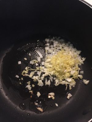 这里,先用猪油(我是把五花肉肥的部分,切下来,炼的猪油)爆香葱姜蒜末。