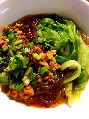 然后,在碗里调酱汁,酱油、醋是主要的多放一点,再放一点麻辣烫底料,还有香油、花椒油、鸡精。把煮粉条的汤(滚开的)盛进酱汁里,再把粉条捞进来,把菜铺好,撒上碎米芽菜肉末,香菜、香葱。一碗热气腾腾的酸辣粉就做好了。