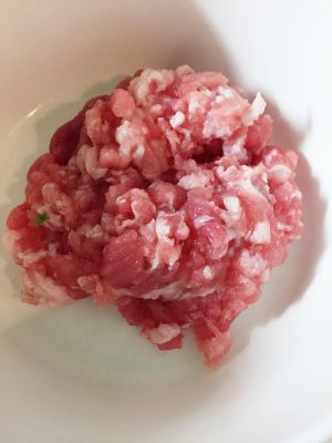 五花肉剁成肉末,备用,和碎米芽菜的比例,一比一即可。