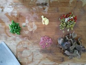 把肉!木耳!酸辣椒!葱姜都切好!肉用少量盐,料酒腌一下!这样的肉入味也比较嫩!
