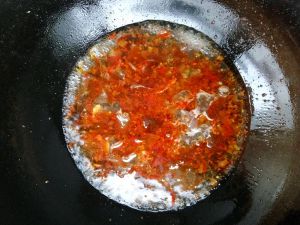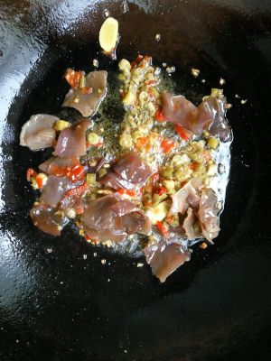 油烧热,把酸辣椒跟姜片倒进去爆一下,加入豆瓣酱炒出红油!加入木耳炒几下!加入水