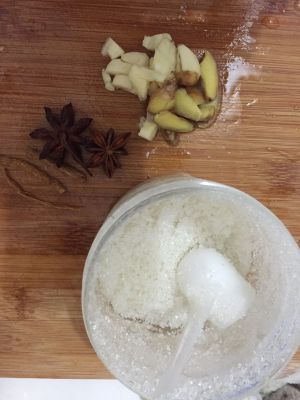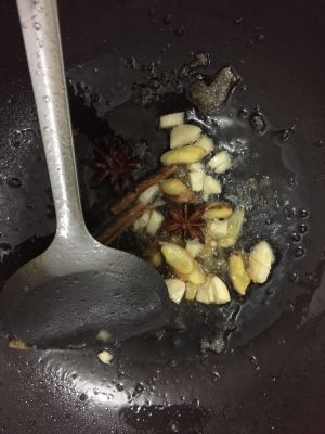 放茶油炒十分钟,锅里放姜,桂皮,八角,蒜米爆香,最后放盐和白糖,生抽