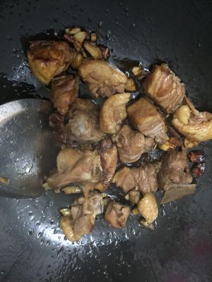下鸭块翻炒5分钟,炒到出鸭油,加一点老抽