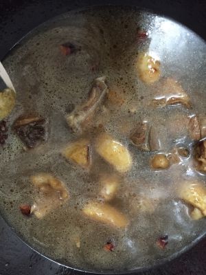 倒入开水!再放香菇(香菇可以提前温水泡半个小时容易人味)花椒八角桂皮等调味料放入!