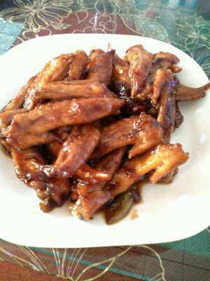 待可乐汁全部裹紧鸡翼后(尽可能的干锅,不留汁),出碟,切几条香菜铺在鸡翼上面!