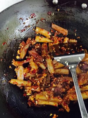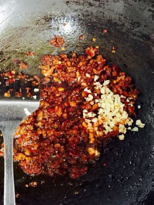 加红油豆瓣加蒜末,这时候加糖。