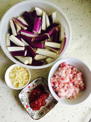 准备好食材。五花肉切丁,稍剁成末,切好蒜末,红油豆瓣酱剁碎,茄子切条。