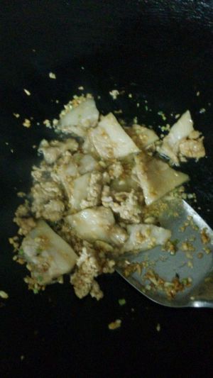 锅中倒油,放入拧过水的茄子翻炒,再放入之前的肉末翻炒均匀,盖上锅盖中火烧制,中间多翻炒几次以免糊锅。