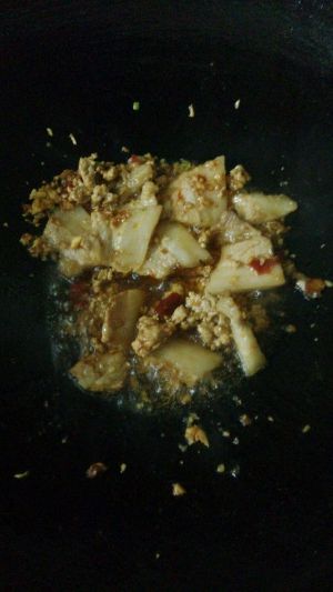 倒入之前的茄子翻炒,可以加入少许水。根据口味加盐、生抽,鸡精随意。