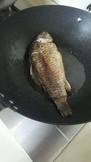 热锅,不粘锅,一薄层的橄榄油(个人习惯,可用其他油),鲫鱼清理干净后用厨房用纸里外吸干水分,油热后下鱼,千万别动鱼,1分钟以后端起锅,轻轻摇使油能滚到鱼上即可,这样不会受热不均匀,鱼中小火至少煎5分钟,稍微用力摇锅里的油,鱼会自己动,实在不动,铲子轻推能动为煎好,换面,如图颜色