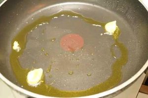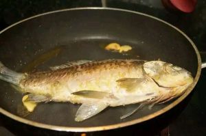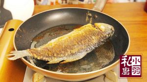 ▲锅里倒油,油热之后将拍了面粉的鲫鱼下锅,下锅后不要动,等晃动锅,鲫鱼能自己动时,再翻面,这样鱼皮就不会破了。