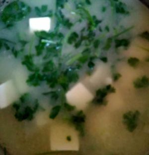 待汤变成奶白色之后放入豆腐,香菜和盐即可