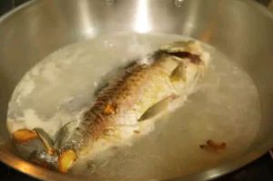 汤锅放入适量的清水,大火烧开后把煎好的鱼连同姜片一起放入汤锅中,大火熬制