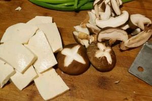 豆腐切片,香菇两朵切片,两朵打十字花刀