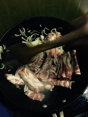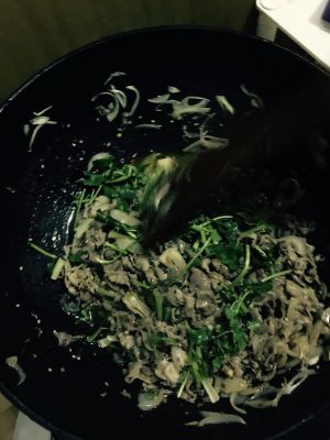 待肉变了颜色,加入调料,最后出锅多放些香菜段,提味儿!不喜欢的可以放红辣椒活着青椒丝啊!