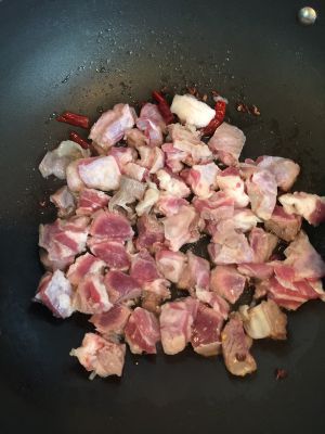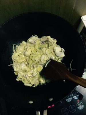 中小火,上油,炒香花椒大料还有蒜,辣椒等,放入洋葱,炒软